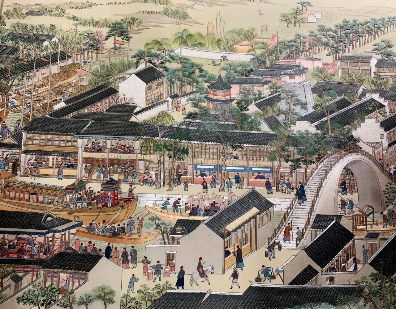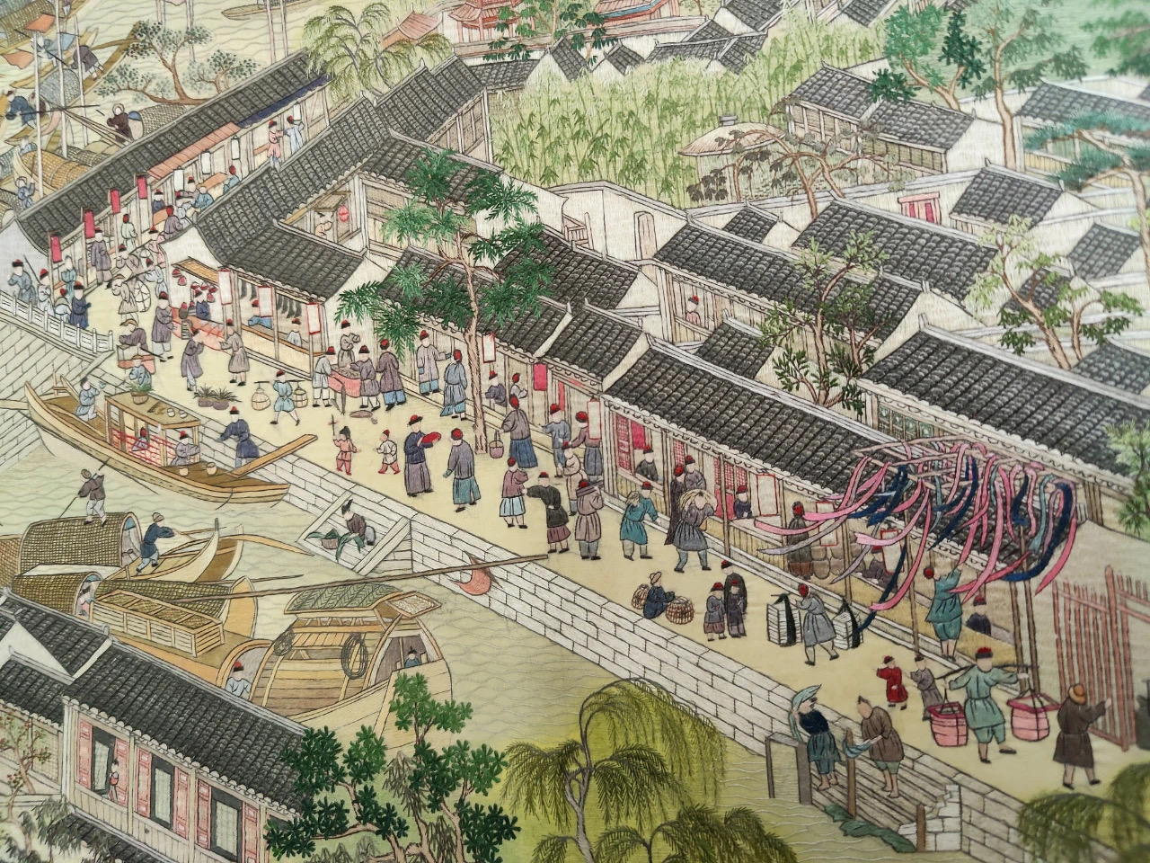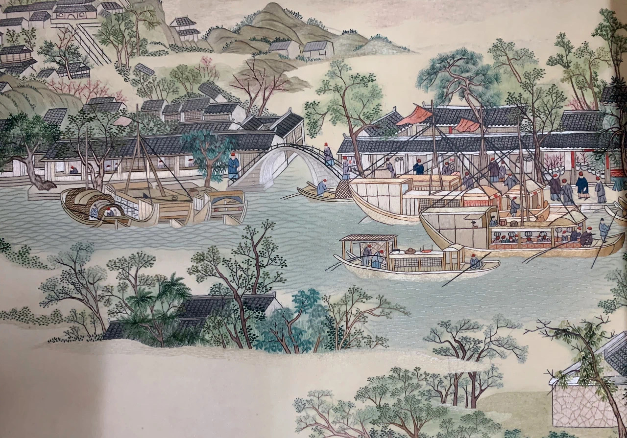 苏绣艺人以针代笔,十分细腻地绣出了江南的湖光山色、田园村舍、民俗风情,官衙商肆。据统计,绣面上约有一万两千余人,近四百只船,五十多座桥,二百多家店铺,两千多栋房屋,全长十二米多的绣卷规模宏大,气势壮阔,在当时创造了绣卷长度的历史之最,不仅完整地表现了原作中气势宏伟的古城苏州市井风貌,而且绣面平整,排针齐密,线光明丽,色泽淡雅,具有苏绣精细雅洁的传统特色,是我国民族文化的传世珍品。