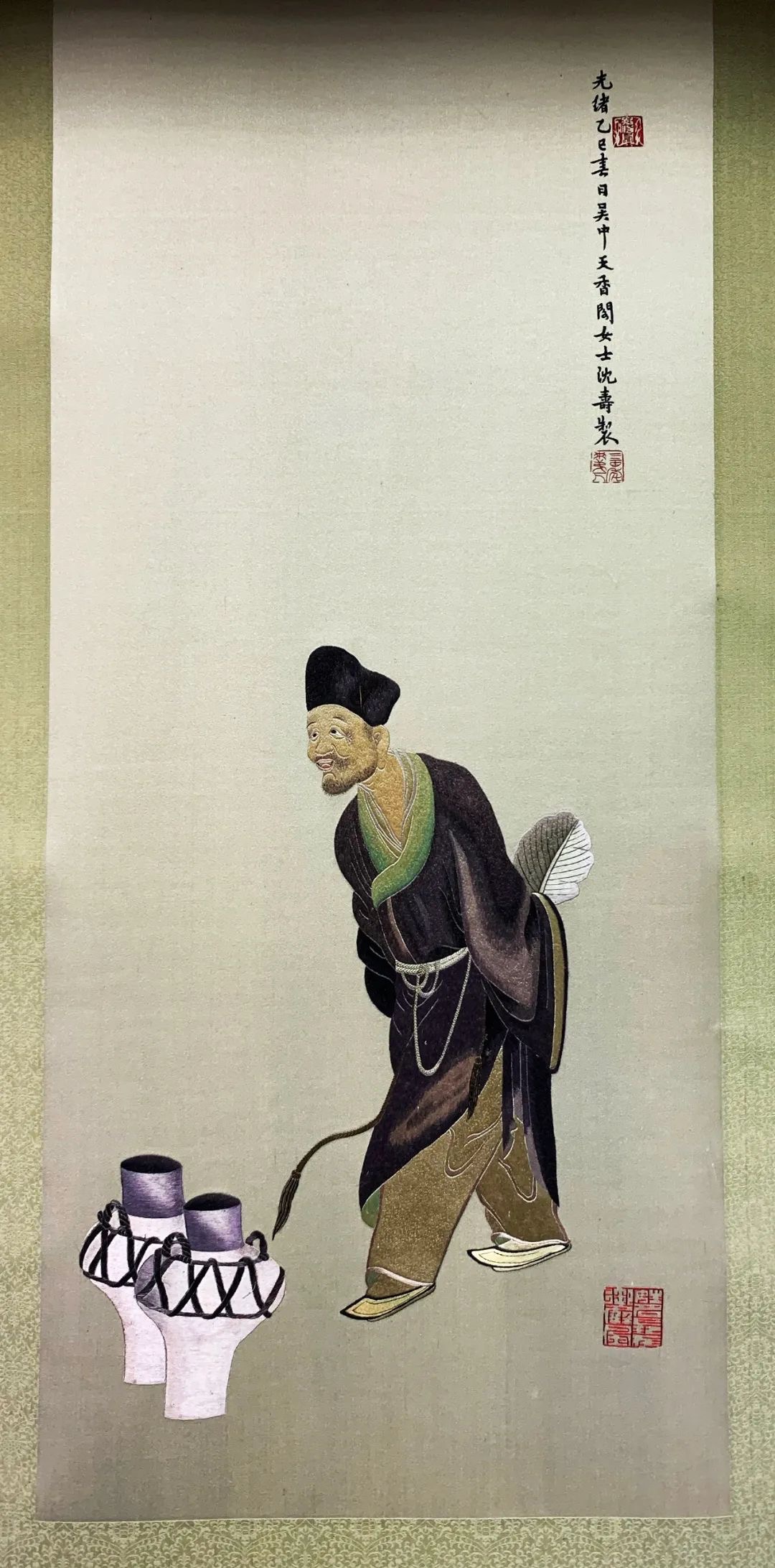 《济公像》画面主体为身着破旧僧服、头戴僧帽的济公,缎面底料上,济公正微弯着背,双手背于身后,手执一把蒲扇,笑容可掬地走向他近处的两坛美酒,表情喜不自胜、垂涎欲滴,淋漓尽致地表现出了如痴如醉,带着乡土气息的鲜活神态,绣面右上部分绣有墨书题记“光绪乙巳春日吴中天香阁女士沈寿制”和白文“御屏风”、朱文“三百年来第一人”两枚红色印章。